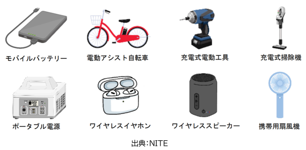 近年、リチウムイオン電池に起因する火災事故等が頻発しています。2020年から2024年までの5年間にNITE製品評価技術基盤機構に報告された火災事故は1,587件におよんでいます。製品別では、モバイルバッテリー、電動アシスト自転車、充電式掃除機、充電式工具、ポータブル電源などの事故が多く報告されています。